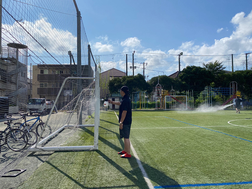 コロナ禍での開催となった為、入口での選手コーチ及び観覧の皆様全員への検温、次亜塩素酸ナトリウムでの消毒、ゴールやベンチの消毒、試合前の消毒を徹底し、熱中症対策として定期的な散水なども実施致しました。